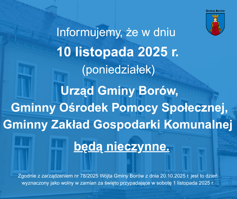 Na podstawie zarządzenia Nr 78/2025 Wójta Gminy Borów z dnia 20 października 2025 r. w poniedziałek 10 listopada 2025 r. Urząd Gminy Borów, Gminny Ośrodek Pomocy Społecznej oraz Gminny Zakład Gospodarki Komunalnej będą nieczynne, w zamian za święto przypadające w sobotę 1 listopada 2025 r. Prosimy o załatwianie spraw urzędowych w pozostałe dni tygodnia.